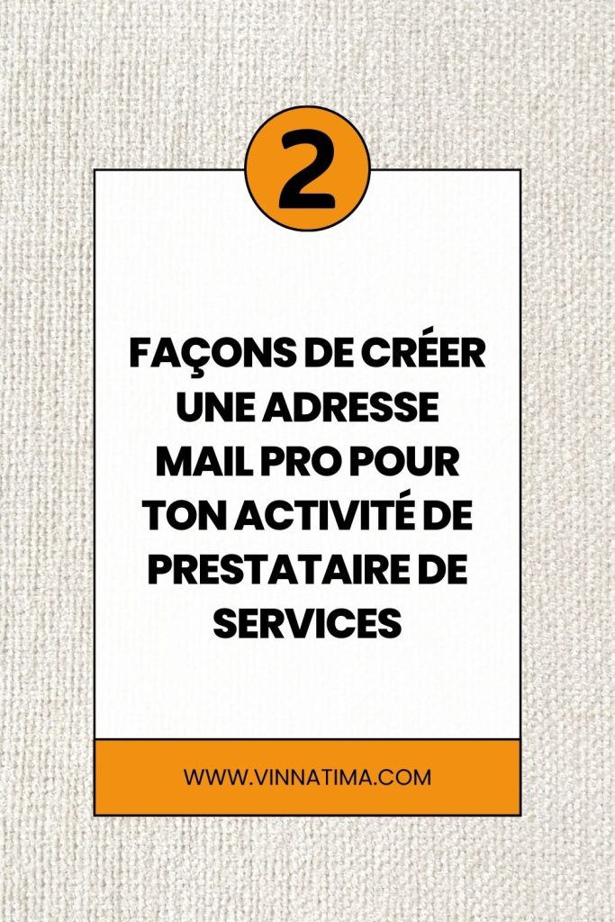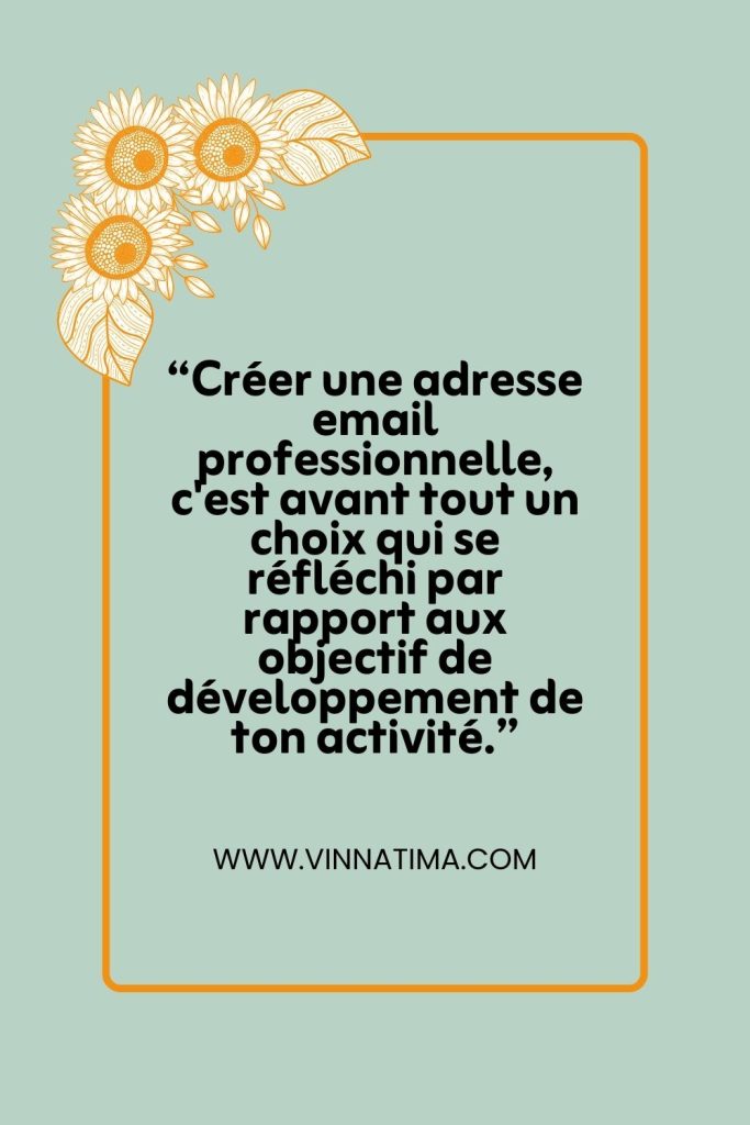 Ce qu’on appelle adresse mail « professionnelle », c’est une adresse email qui porte le nom de ton entreprise, après le @. Généralement, cela correspond au nom de domaine utilisé par ton site internet. Par exemple, chez Vinna Tima, le suffixe de tous nos mails est @vinnatima.com . Cela permet de communiquer clairement sur ta marque et ton activité.