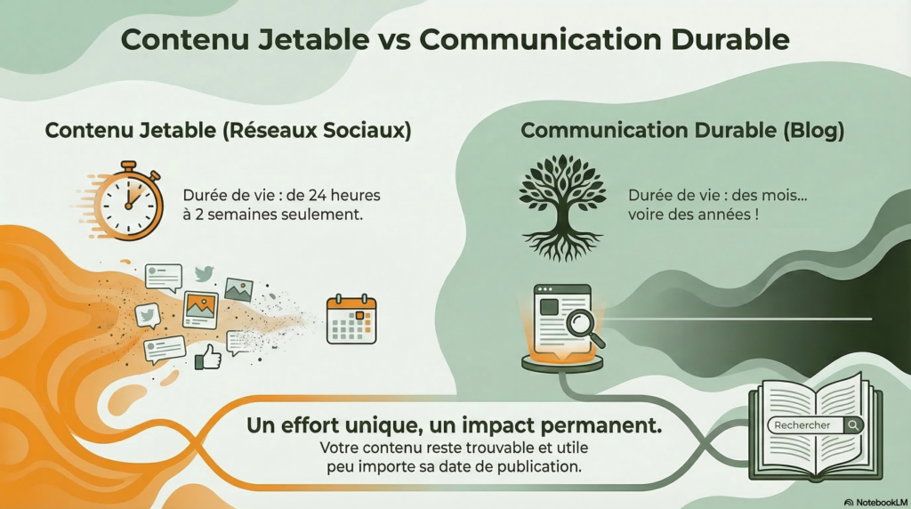 Alors qu’en investissant le même temps dans la création d’un blog, tu investis pour une communication durable. Tes articles de blogs peuvent encore faire leur effet plusieurs mois ou années après leur publication. Ils sont un lien direct avec une audience qui a besoin de tes services, et cela leur permet de te trouver TOI, peu importe que tu ai publié il y a 3 jours ou 3 ans.